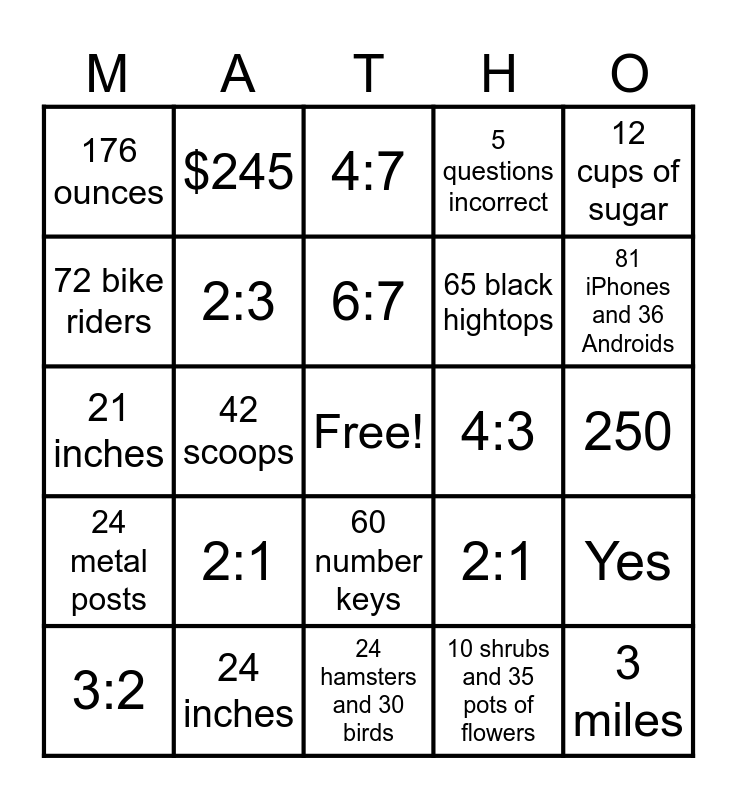 This bingo card has a free space and 29 words: 3:2, 9:5, 42 scoops, 42 minutes, 176 ounces, 4:7, 2:3, 2:1, 4:3, 24 inches, 250, 3 miles, 24 hamsters and 30 birds, 10 shrubs and 35 pots of flowers, 81 iPhones and 36 Androids, 12 teachers to 260 students, 60 number keys, 24 metal posts, 12 cups of sugar, 21 inches, 2:1, 8:7, 65 black hightops, 72 bike riders, 5 questions incorrect, $245, Yes, 6:7 and 87:18.