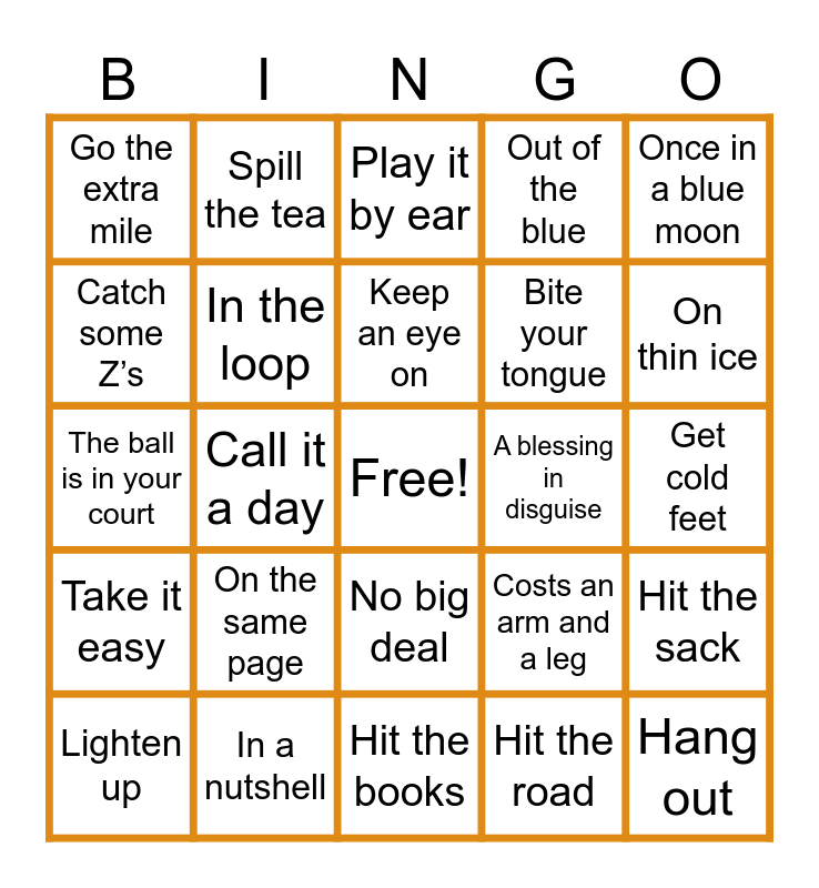 This bingo card has a free space and 50 words: Break the ice, Hang out, In hot water, Hit the books, On the same page, Piece of cake, Spill the tea, Spill the beans, Catch some Z’s, Under the weather, In the loop, Out of the blue, Hit the sack, Costs an arm and a leg, Let the cat out of the bag, Cut corners, Keep an eye on, A blessing in disguise, Break a leg, Once in a blue moon, Call it a day, Hit the road, Go the extra mile, Bite your tongue, On cloud nine, Have mixed feelings, On thin ice, The last straw, Play it by ear, No big deal, In the same boat, By the book, A piece of the pie, A win-win, In a nutshell, Go for it, Under pressure, Pull yourself together, Blow off steam, Get cold feet, Stay in your lane, Think outside the box, Get your act together, It’s not my cup of tea, Lighten up, The ball is in your court, Cut to the chase, Keep your cool, Take it easy and A wake-up call.