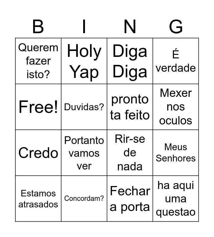 This bingo card has 16 words: Concordam?, Meus Senhores, Diga Diga, Querem fazer isto?, Credo, Holy Yap, Rir-se de nada, Fechar a porta, Free!, Duvidas?, Estamos atrasados, É verdade, Portanto vamos ver, Mexer nos oculos, pronto ta feito and ha aqui uma questao.