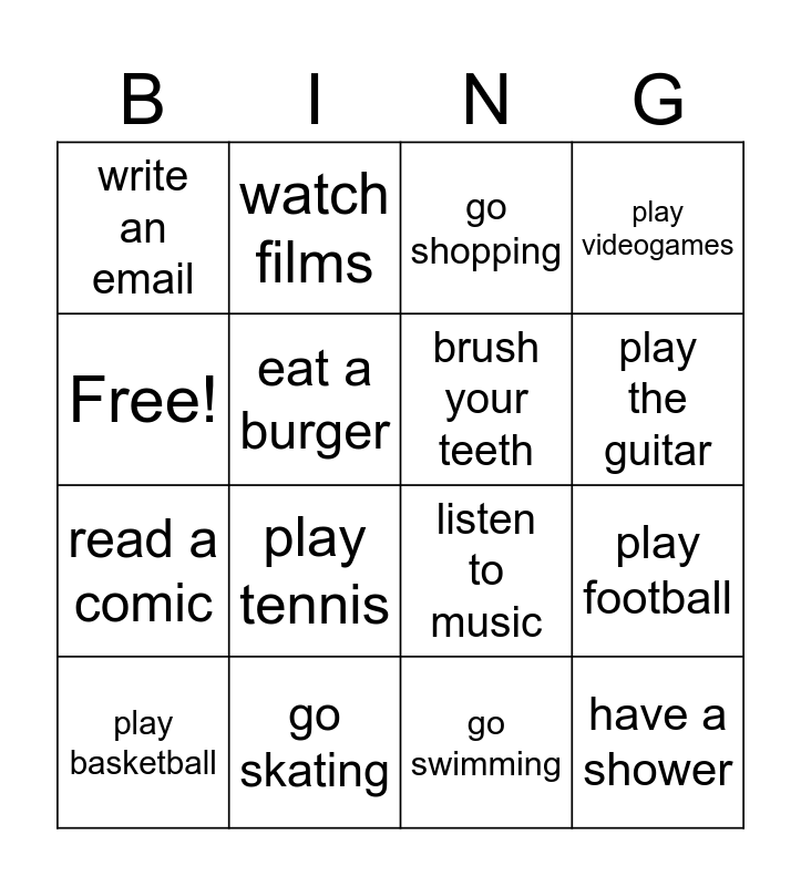 This bingo card has 16 words: go skating, play football, go shopping, write an email, read a comic, watch films, listen to music, go swimming, Free!, eat a burger, play basketball, play videogames, play tennis, play the guitar, brush your teeth and have a shower.