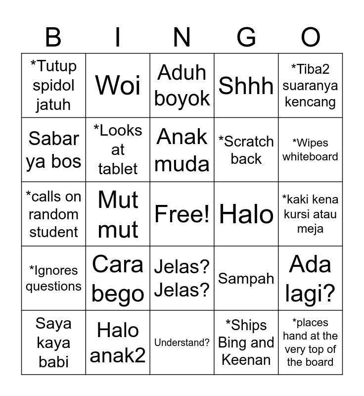 This bingo card has a free space and 24 words: Cara bego, Halo anak2, Anak muda, Saya kaya babi, *Tiba2 suaranya kencang, *Tutup spidol jatuh, Sabar ya bos, Woi, Halo, Jelas? Jelas?, *Scratch back, *calls on random student, Sampah, Ada lagi?, *Looks at tablet, *Ships Bing and Keenan, *kaki kena kursi atau meja, Aduh boyok, *Wipes whiteboard, Mut mut, *places hand at the very top of the board, *Ignores questions, Shhh and Understand?.