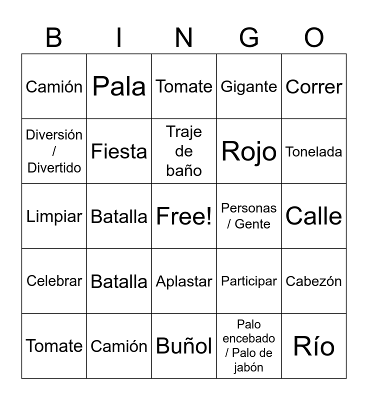 This bingo card has a free space and 29 words: Tomate, Fiesta, Batalla, Personas, Camión, Tomate, Fiesta, Batalla, Personas / Gente, Camión, Calle, Río, Buñol, Palo encebado / Palo de jabón, Tonelada, Lanzar / Tirar, Aplastar, Celebrar, Correr, Limpiar, Participar, Viajar, Rojo, Diversión / Divertido, Gigante, Pala, Cabezón, Traje de baño and Herir / Doler.