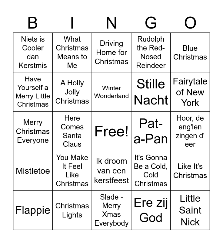 This bingo card has a free space and 77 words: All I Want for Christmas Is You, Last Christmas, Driving Home for Christmas, White Christmas, Happy Xmas (War Is Over), It's the Most Wonderful Time of the Year, Let It Snow! Let It Snow! Let It Snow!, Jingle Bell Rock, Rockin' Around the Christmas Tree, Do They Know It's Christmas?, Step Into Christmas, Santa Claus Is Comin' to Town, Winter Wonderland, Have Yourself a Merry Little Christmas, Feliz Navidad, Here Comes Santa Claus, Sleigh Ride, Little Saint Nick, Jingle Bells, Blue Christmas, It's Beginning to Look a Lot Like Christmas, Merry Christmas Everyone, A Holly Jolly Christmas, What Christmas Means to Me, Rudolph the Red-Nosed Reindeer, The Christmas Song (Chestnuts Roasting on an Open Fire), Wonderful Christmastime, Santa Baby, Peace on Earth/Little Drummer Boy, Thank God It's Christmas, Walking in the Air, Merry Christmas Darling, Run Rudolph Run, It's Gonna Be a Cold, Cold Christmas, Fairytale of New York, Stille Nacht, O Dennenboom, Komt allen tezamen, Hoor, de eng'len zingen d' eer, Ere zij God, De herdertjes lagen bij nachte, Nu zijt wellekome, Er is een kindeke geboren op aard, Midden in de winternacht, We Wish You a Merry Christmas, Eenzame Kerst, Flappie, Niets is Cooler dan Kerstmis, Vrolijk Kerstfeest, Kerstmis, je bent welkom hier, De Kerstman die komt zeker bij ons langs, Ik droom van een kerstfeest, Wonderful Dream (Holiday for Everyone), My Only Wish (This Year), Underneath the Tree, Holly Jolly Christmas, Someday at Christmas, Driving Home for Christmas (andere versies), One More Sleep, Santa Tell Me, You Make It Feel Like Christmas, Here We Come A-Caroling, Deck the Hall, Jolly Old Saint Nicholas, Up on the Housetop, I Heard the Bells on Christmas Day, Good King Wenceslas, Pat-a-Pan, Fum, Fum, Fum, The Twelve Days of Christmas, Cold December Night, Like It's Christmas, Mistletoe, Christmas Lights, Shake Up Christmas, Slade - Merry Xmas Everybody and Greg Lake - I Believe in Father Christmas.