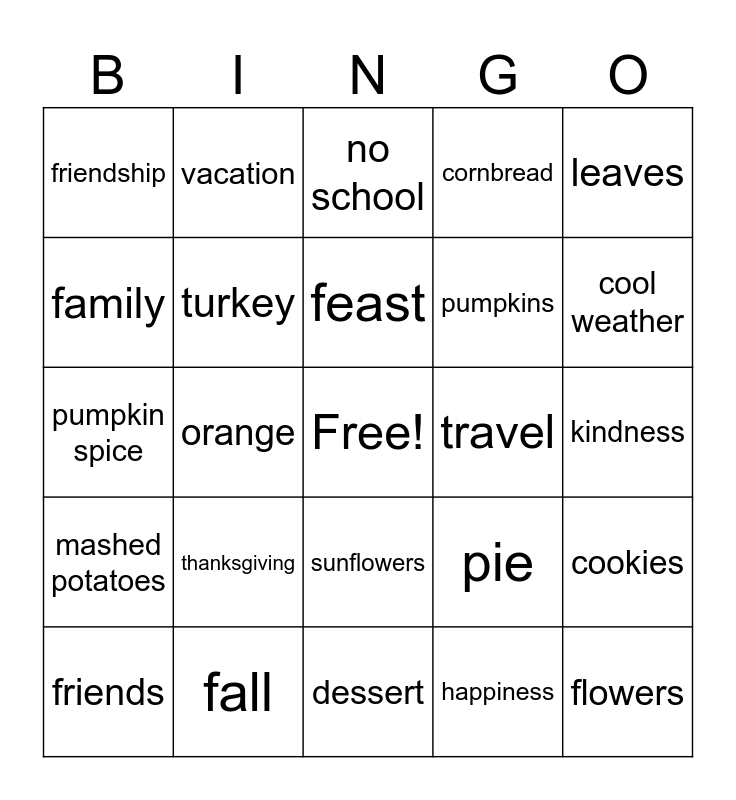 This bingo card has a free space and 24 words: thanksgiving, fall, feast, friends, leaves, friendship, family, vacation, travel, sunflowers, pumpkins, pumpkin spice, pie, cookies, turkey, happiness, kindness, no school, cool weather, orange, flowers, mashed potatoes, cornbread and dessert.