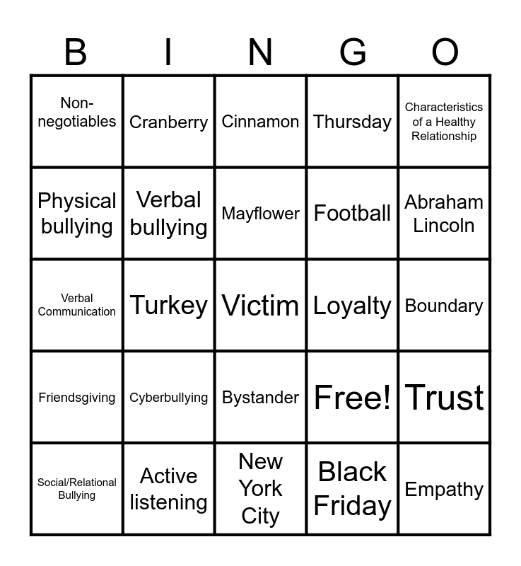 This bingo card has 25 words: Cyberbullying, New York City, Mayflower, Social/Relational Bullying, Characteristics of a Healthy Relationship, Non-negotiables, Physical bullying, Cranberry, Loyalty, Bystander, Football, Verbal Communication, Free!, Trust, Verbal bullying, Empathy, Boundary, Cinnamon, Abraham Lincoln, Turkey, Victim, Active listening, Friendsgiving, Thursday and Black Friday.