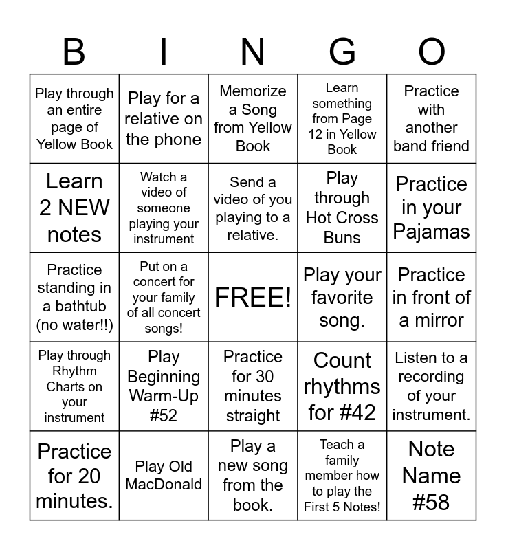 This bingo card has a free space and 24 words: Play Beginning Warm-Up #52, Play Old MacDonald, Send a video of you playing to a relative., Practice for 20 minutes., Practice with another band friend, Play through an entire page of Yellow Book, Learn 2 NEW notes, Play for a relative on the phone, Play your favorite song., Practice for 30 minutes straight, Play through Hot Cross Buns, Practice standing in a bathtub (no water!!), Count rhythms for #42, Listen to a recording of your instrument., Watch a video of someone playing your instrument, Teach a family member how to play the First 5 Notes!, Practice in front of a mirror, Memorize a Song from Yellow Book, Practice in your Pajamas, Put on a concert for your family of all concert songs!, Note Name #58, Play through Rhythm Charts on your instrument, Learn something from Page 12 in Yellow Book and Play a new song from the book..