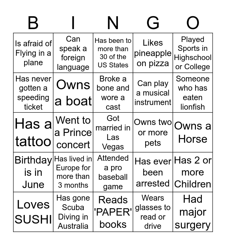This bingo card has a free space and 24 words: Has lived in Europe for more than 3 months, Has gone Scuba Diving in Australia, Broke a bone and wore a cast, Loves SUSHI, Played Sports in Highschool or College, Is afraid of Flying in a plane, Has never gotten a speeding ticket, Can speak a foreign language, Owns two or more pets, Attended a pro baseball game, Can play a musical instrument, Has a tattoo, Has ever been arrested, Has 2 or more Children, Owns a boat, Wears glasses to read or drive, Owns a Horse, Has been to more than 30 of the US States, Someone who has eaten lionfish, Went to a Prince concert, Had major surgery, Birthday is in June, Likes pineapple on pizza and Reads 'PAPER' books.