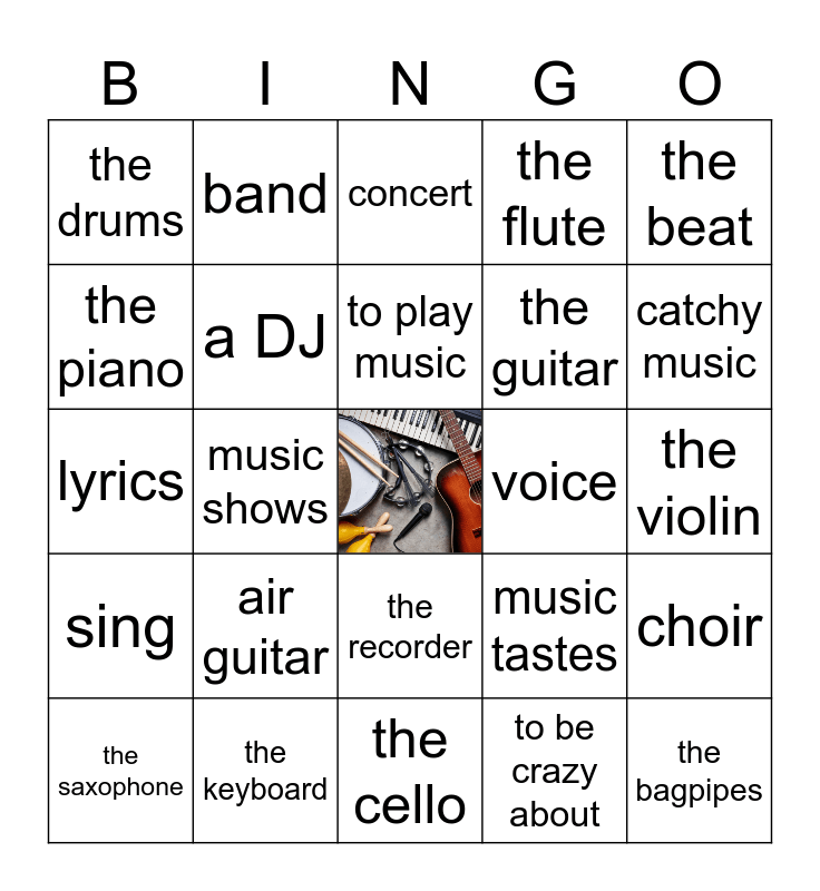 This bingo card has a free space and 27 words: music tastes, to listen to, the guitar, the cello, the piano, concert, band, sing, voice, choir, lyrics, the flute, the saxophone, the keyboard, catchy music, music downloads, a DJ, to play music, air guitar, the drums, the violin, to be crazy about, music shows, the bagpipes, the recorder, the beat and a singer.