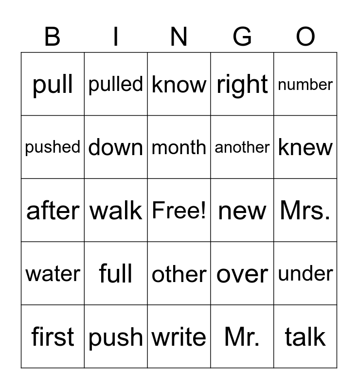 This bingo card has a free space and 24 words: full, push, month, first, number, pull, pushed, pulled, new, other, another, after, over, under, down, Mr., Mrs., know, knew, walk, talk, water, right and write.