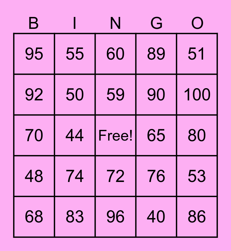 This bingo card has a free space and 32 words: 40, 42, 44, 46, 48, 50, 51, 53, 55, 57, 59, 60, 61, 63, 65, 66, 68, 70, 72, 74, 76, 78, 80, 83, 86, 89, 90, 92, 95, 96, 99 and 100.