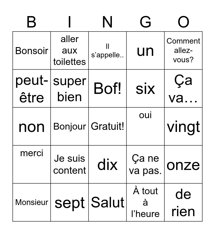 This bingo card has a free space and 24 words: Je suis content, sept, Bof!, Monsieur, Comment allez-vous?, Bonsoir, peut-être, aller aux toilettes, oui, dix, six, non, Ça ne va pas., onze, super bien, À tout à l’heure, vingt, Il s’appelle.., Ça va…, Bonjour, de rien, merci, un and Salut.