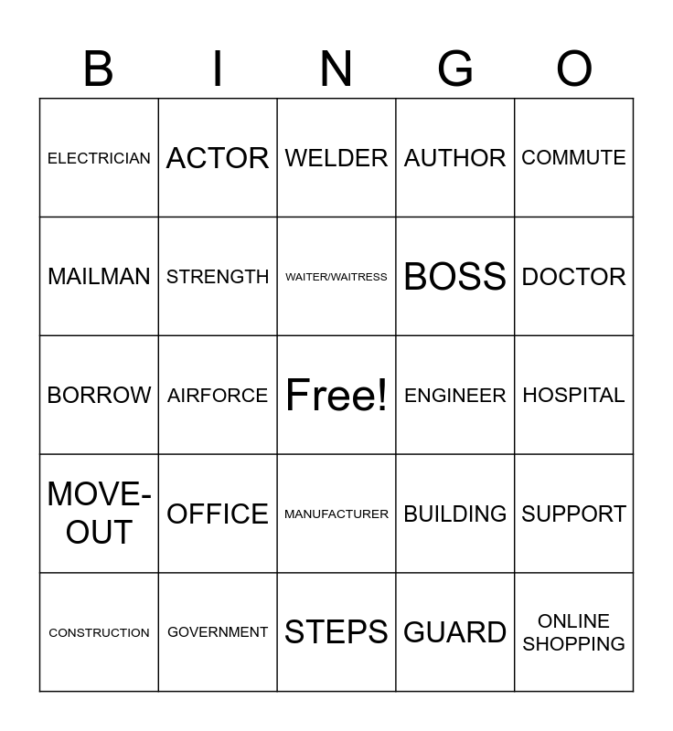 This bingo card has a free space and 72 words: ACCOUNTANT, ACTOR, AIRFORCE, ARCHITECT, ARTIST, ASSISTANT, AUTHOR, BLOG, BOSS, CARPENTER, CONSTRUCTION, DENTIST, DOCTOR, ELECTRICIAN, BECOME, BORROW, BUILDING, COMMUTE, FARM, HOSPITAL, OFFICE, ONLINE SHOPPING, SUPPORT, STORE, BUSINESS, COMPANY, EMERGENCY, SERVICE, EMPLOYEE, FIREMAN, GOVERNMENT, POLITICS, INFANTRY, JAIL/PRISON, GUARD, JANITOR, LAWYER, LIBRARIAN, MAILMAN, MANAGER, MANUFACTURER, MECHANIC/ PLUMBER, PHOTOGRAPHER, POLICEMAN, MOVE, MOVE-OUT, NAVY, NURSE, PILOT, PRESIDENT, BARISTA, SCIENTIST, SECRETARY, ENGINEER, SURGEON, REPAIR PERSON, WELDER, WAITER/WAITRESS, INTERPRETER, AUDIOLOGIST, GOAL, ACHIEVE, DREAM, STEPS, IMPROVE, CHANGE, STRENGTH, WEAKNESS, PRO, CON, FAMOUS and KEEP.