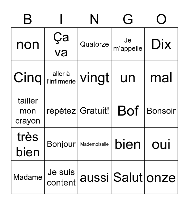 This bingo card has a free space and 24 words: Bonjour, Je suis content, vingt, Madame, Dix, non, Cinq, Ça va, Bof, Mademoiselle, un, tailler mon crayon, bien, oui, aller à l’infirmerie, Salut, Bonsoir, Quatorze, mal, répétez, onze, très bien, Je m’appelle and aussi.