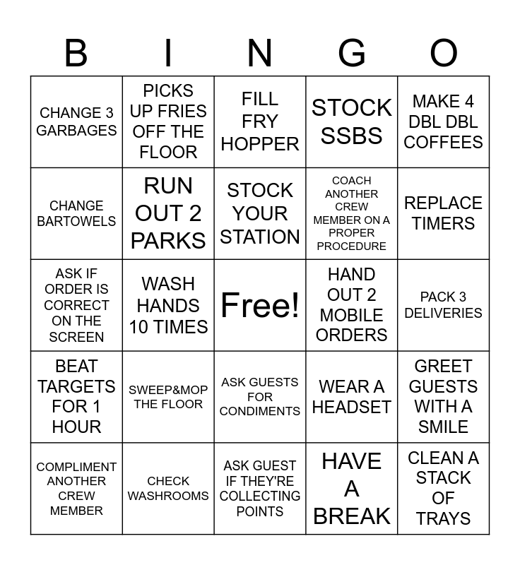 This bingo card has a free space and 24 words: SWEEP&MOP THE FLOOR, CHECK WASHROOMS, STOCK YOUR STATION, COMPLIMENT ANOTHER CREW MEMBER, MAKE 4 DBL DBL COFFEES, CHANGE 3 GARBAGES, CHANGE BARTOWELS, PICKS UP FRIES OFF THE FLOOR, HAND OUT 2 MOBILE ORDERS, ASK GUESTS FOR CONDIMENTS, COACH ANOTHER CREW MEMBER ON A PROPER PROCEDURE, ASK IF ORDER IS CORRECT ON THE SCREEN, WEAR A HEADSET, GREET GUESTS WITH A SMILE, RUN OUT 2 PARKS, HAVE A BREAK, PACK 3 DELIVERIES, FILL FRY HOPPER, REPLACE TIMERS, WASH HANDS 10 TIMES, CLEAN A STACK OF TRAYS, BEAT TARGETS FOR 1 HOUR, STOCK SSBS and ASK GUEST IF THEY'RE COLLECTING POINTS.