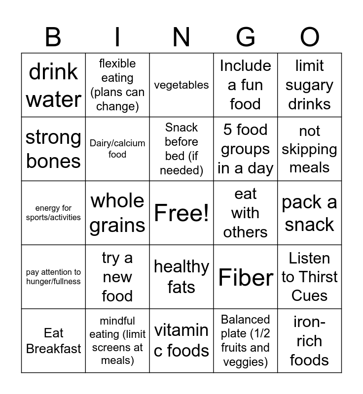 This bingo card has a free space and 29 words: Eat Breakfast, Fruit, whole grains, protein food, drink water, vegetables, Dairy/calcium food, try a new food, eat with others, mindful eating (limit screens at meals), pack a snack, iron-rich foods, vitamin c foods, Balanced plate (1/2 fruits and veggies), not skipping meals, calcium rich foods, healthy fats, pay attention to hunger/fullness, limit sugary drinks, energy for sports/activities, Fiber, steady blood sugar, 5 food groups in a day, strong bones, Include a fun food, flexible eating (plans can change), Listen to Thirst Cues, Snack before bed (if needed) and Ask for help with meals.