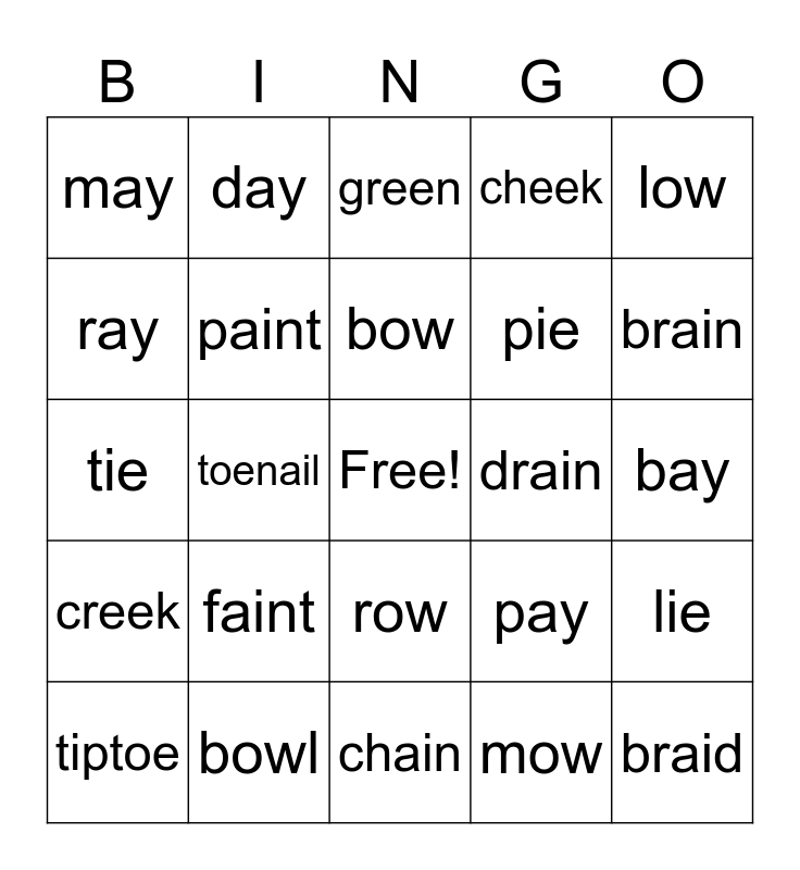 This bingo card has a free space and 26 words: row, mow, bow, bowl, low, may, ray, day, bay, pay, pie, tie, lie, tiptoe, toenail, rowboat, cheek, creek, green, braid, brain, chain, drain, faint, paint and pancake.