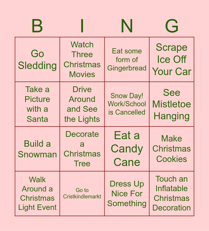This bingo card has 16 words: Go to Cristkindlemarkt, Make Christmas Cookies, Eat some form of Gingerbread, Go Sledding, Build a Snowman, Watch Three Christmas Movies, Eat a Candy Cane, Dress Up Nice For Something, Take a Picture with a Santa, Drive Around and See the Lights, Walk Around a Christmas Light Event, Scrape Ice Off Your Car, Decorate a Christmas Tree, See Mistletoe Hanging, Snow Day! Work/School is Cancelled and Touch an Inflatable Christmas Decoration.