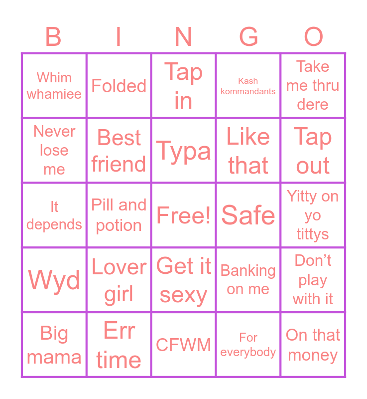 This bingo card has a free space and 24 words: Lover girl, Err time, Typa, Big mama, Take me thru dere, Whim whamiee, Never lose me, Folded, Safe, Get it sexy, Like that, It depends, Banking on me, Don’t play with it, Best friend, For everybody, Yitty on yo tittys, Tap in, Tap out, Pill and potion, On that money, Wyd, Kash kommandants and CFWM.