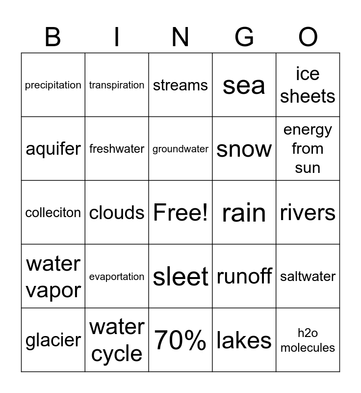 This bingo card has a free space and 24 words: evaportation, water cycle, groundwater, glacier, ice sheets, precipitation, aquifer, transpiration, rain, sleet, snow, colleciton, runoff, saltwater, freshwater, lakes, rivers, streams, energy from sun, clouds, h2o molecules, water vapor, sea and 70%.