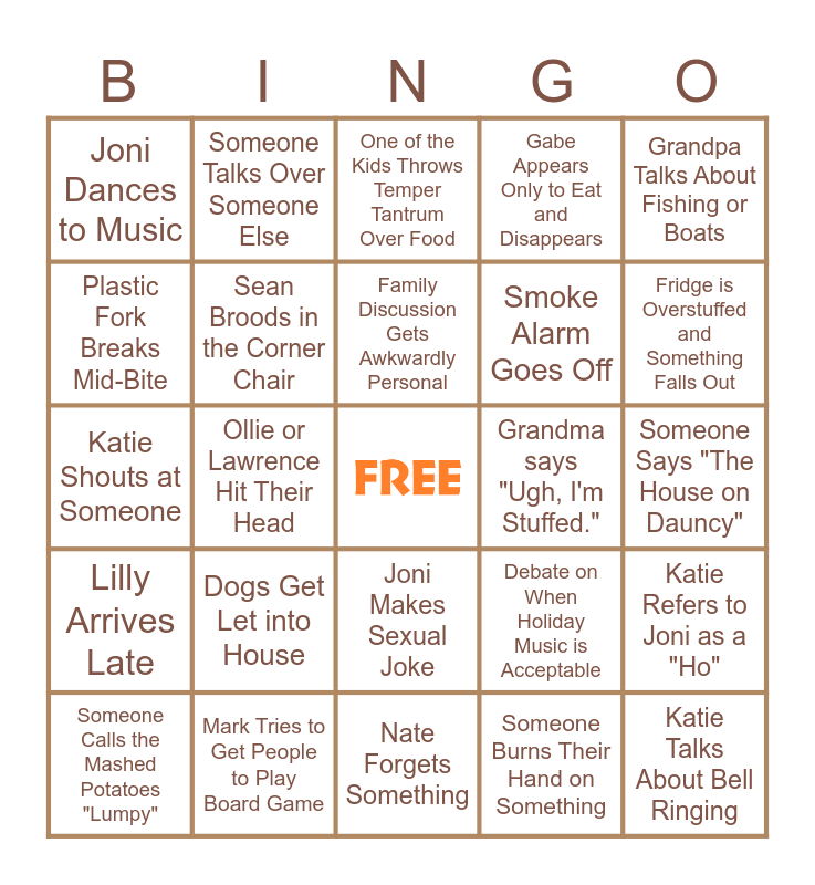 This bingo card has a free space and 41 words: Katie Arrives Late, Katie Shouts at Someone, Jenny Shouts at Someone, Sean Broods in the Corner Chair, Mark Tries to Get People to Play Board Game, Joni Makes Sexual Joke, Family Discussion Gets Awkwardly Personal, Grandma Goes Outside for Cigarette, Grandpa Talks About Fishing or Boats, Lilly Arrives Late, Ollie or Lawrence Hit Their Head, Gabe Appears Only to Eat and Disappears, Katie Talks About Bell Ringing, Someone Says "The House on Dauncy", Grandma says "Ugh, I'm Stuffed.", Dogs Get Let into House, Trivia/Board Game Gets Heated, Joni Dances to Music, Katie Tells Someone "Go Out to My Car and Get ...", One of the Kids Throws Temper Tantrum Over Food, Katie Refers to Joni as a "Ho", Someone Saying the Lions Will "Bounce Back", Nate Forgets Something, Smoke Alarm Goes Off, Someone Shatters Plate or Glass, Someone Forgets Item in the Oven, Someone Burns Their Hand on Something, Unexpected Guest Shows Up, Fridge is Overstuffed and Something Falls Out, Classic "Dad Joke" Groans Across The Room, Johnnie Brings Up Weird/Nerdy Fact Nobody Asked For, Someone Talks Over Someone Else, Someone Calls the Mashed Potatoes "Lumpy", Plastic Packaging Accidentally Cooked with Something, Debate on When Holiday Music is Acceptable, Plastic Fork Breaks Mid-Bite, Someone Mentions "There's No Ice", Passive-Aggressive Comment About Someone’s Cooking, Someone Tries to Bring Up Politics, Someone Tries to Mimic Another's Voice Jokingly and Someone Falls Asleep on Couch/Floor.