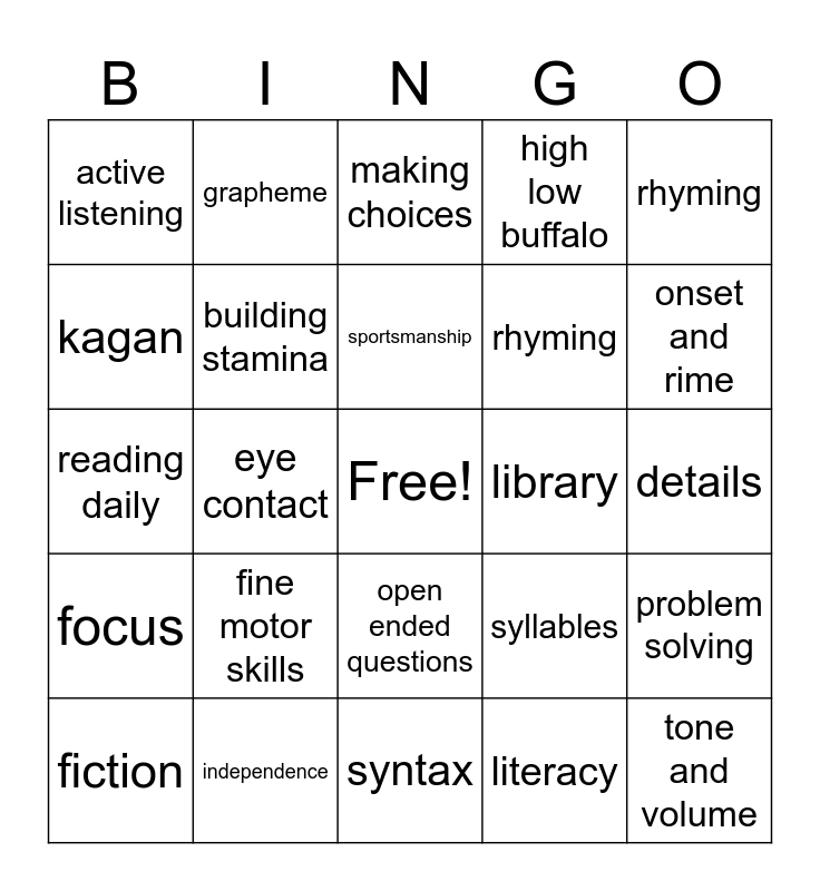 This bingo card has a free space and 40 words: limiting technology, reading daily, taking turns, building stamina, independence, open ended questions, sportsmanship, vocabulary, rhyming, focus, eye contact, high low buffalo, tone and volume, details, library, fine motor skills, complete sentences, active listening, patiences, making choices, problem solving, literacy, rhyming, kagan, P.A.S.T., phonological awareness, nonsense words, routines, Zones of Regulation, gross motor skills, nonfiction, fiction, orthographic mapping, syllables, onset and rime, syntax, morphology, Semantics, grapheme and morpheme.