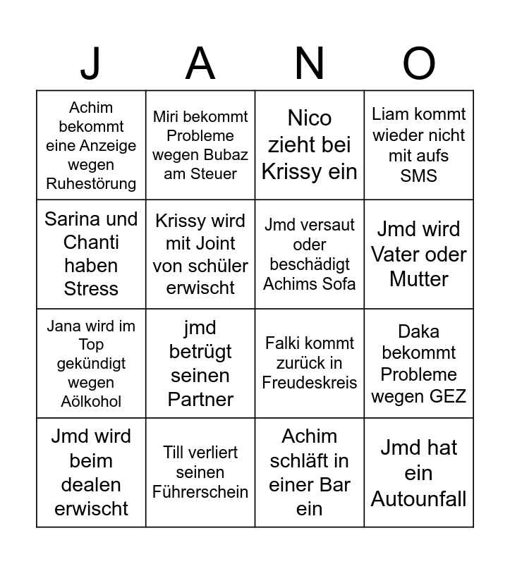This bingo card has 16 words: Till verliert seinen Führerschein, Daka bekommt Probleme wegen GEZ, Nico zieht bei Krissy ein, Achim bekommt eine Anzeige wegen Ruhestörung, Jana wird im Top gekündigt wegen Aölkohol, Miri bekommt Probleme wegen Bubaz am Steuer, Falki kommt zurück in Freudeskreis, Achim schläft in einer Bar ein, Sarina und Chanti haben Stress, Krissy wird mit Joint von schüler erwischt, Jmd wird beim dealen erwischt, Liam kommt wieder nicht mit aufs SMS, jmd betrügt seinen Partner, Jmd wird Vater oder Mutter, Jmd versaut oder beschädigt Achims Sofa and Jmd hat ein Autounfall.