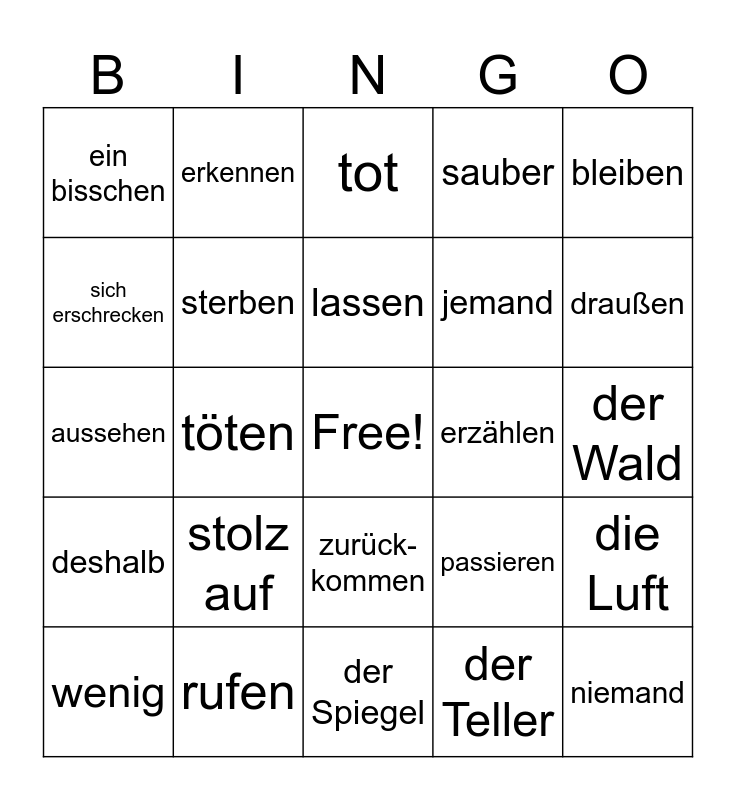 This bingo card has a free space and 29 words: wenig, der Becher, töten, neidisch, ein bisschen, tot, sterben, stolz auf, erzählen, rufen, der Wald, niemand, der Spiegel, der Teller, draußen, Angst vor, zurück-kommen, deshalb, bleiben, aussehen, passieren, die Geschichte, jemand, sich erschrecken, sauber, erkennen, die Luft, lassen and nehmen.