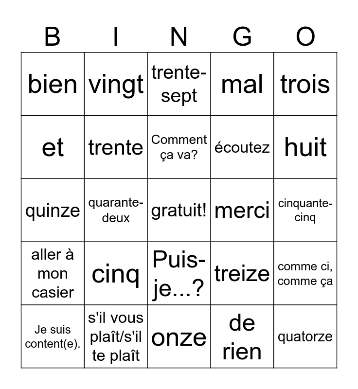 This bingo card has a free space and 24 words: cinq, s'il vous plaît/s'il te plaît, Comment ça va?, Je suis content(e)., trois, bien, et, vingt, merci, Puis-je...?, écoutez, quinze, treize, comme ci, comme ça, trente, de rien, cinquante-cinq, trente-sept, huit, quarante-deux, quatorze, aller à mon casier, mal and onze.