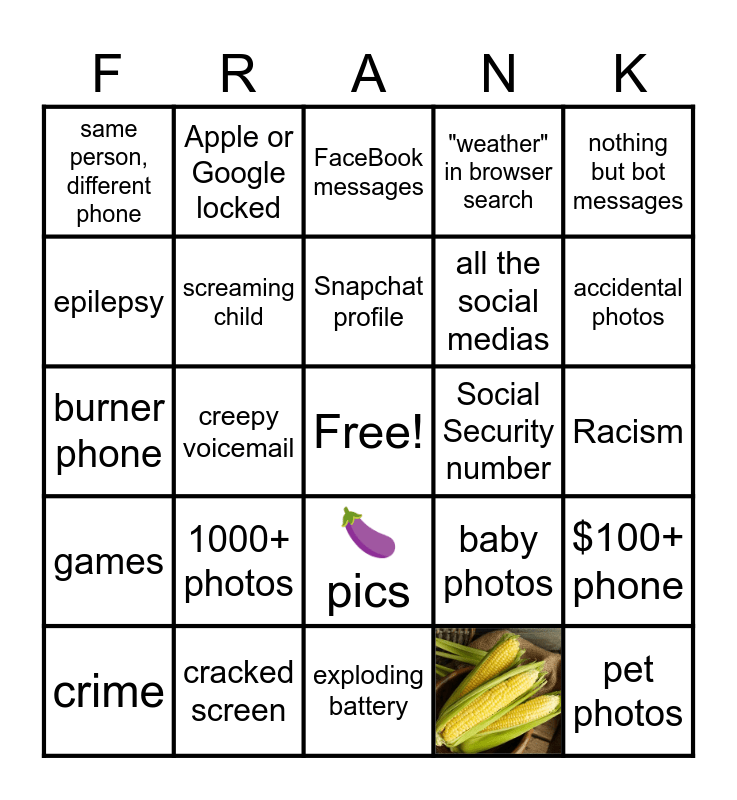 This bingo card has 1 images, a free space and 23 words: 1000+ photos, cracked screen, Snapchat profile, crime, nothing but bot messages, same person, different phone, epilepsy, Apple or Google locked, Social Security number, 🍆 pics, all the social medias, burner phone, baby photos, $100+ phone, screaming child, Racism, FaceBook messages, accidental photos, creepy voicemail, pet photos, games, "weather" in browser search and exploding battery.
