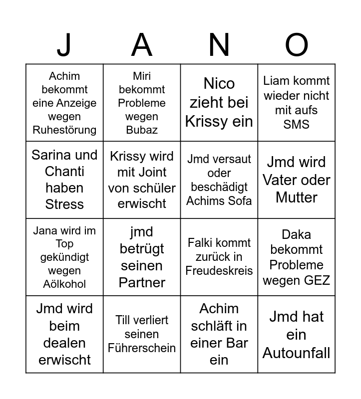 This bingo card has 16 words: Till verliert seinen Führerschein, Daka bekommt Probleme wegen GEZ, Nico zieht bei Krissy ein, Achim bekommt eine Anzeige wegen Ruhestörung, Jana wird im Top gekündigt wegen Aölkohol, Miri bekommt Probleme wegen Bubaz, Falki kommt zurück in Freudeskreis, Achim schläft in einer Bar ein, Sarina und Chanti haben Stress, Krissy wird mit Joint von schüler erwischt, Jmd wird beim dealen erwischt, Liam kommt wieder nicht mit aufs SMS, jmd betrügt seinen Partner, Jmd wird Vater oder Mutter, Jmd versaut oder beschädigt Achims Sofa and Jmd hat ein Autounfall.
