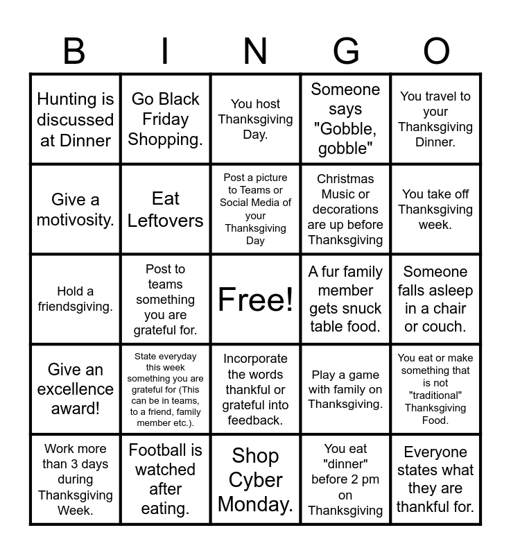 This bingo card has a free space and 24 words: State everyday this week something you are grateful for (This can be in teams, to a friend, family member etc.)., Football is watched after eating., Post a picture to Teams or Social Media of your Thanksgiving Day, Work more than 3 days during Thanksgiving Week., You travel to your Thanksgiving Dinner., Hunting is discussed at Dinner, Give a motivosity., Go Black Friday Shopping., A fur family member gets snuck table food., Incorporate the words thankful or grateful into feedback., Christmas Music or decorations are up before Thanksgiving, Hold a friendsgiving., Play a game with family on Thanksgiving., You eat or make something that is not "traditional" Thanksgiving Food., Eat Leftovers, You eat "dinner" before 2 pm on Thanksgiving, Someone falls asleep in a chair or couch., You host Thanksgiving Day., You take off Thanksgiving week., Post to teams something you are grateful for., Everyone states what they are thankful for., Give an excellence award!, Someone says "Gobble, gobble" and Shop Cyber Monday..