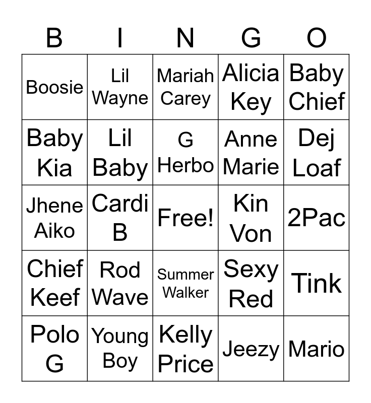 This bingo card has a free space and 24 words: Rod Wave, Young Boy, G Herbo, Polo G, Baby Chief, Boosie, Baby Kia, Lil Wayne, Kin Von, Summer Walker, Anne Marie, Jhene Aiko, Sexy Red, Tink, Lil Baby, Jeezy, 2Pac, Mariah Carey, Dej Loaf, Cardi B, Mario, Chief Keef, Alicia Key and Kelly Price.