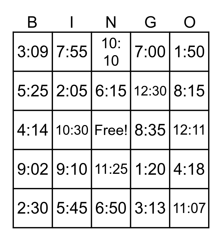 This bingo card has a free space and 24 words: 2:30, 9:10, 6:15, 3:13, 1:50, 3:09, 7:55, 10: 10, 8:35, 12:11, 4:14, 2:05, 1:20, 4:18, 5:25, 5:45, 6:50, 7:00, 8:15, 9:02, 10:30, 11:25, 12:30 and 11:07.