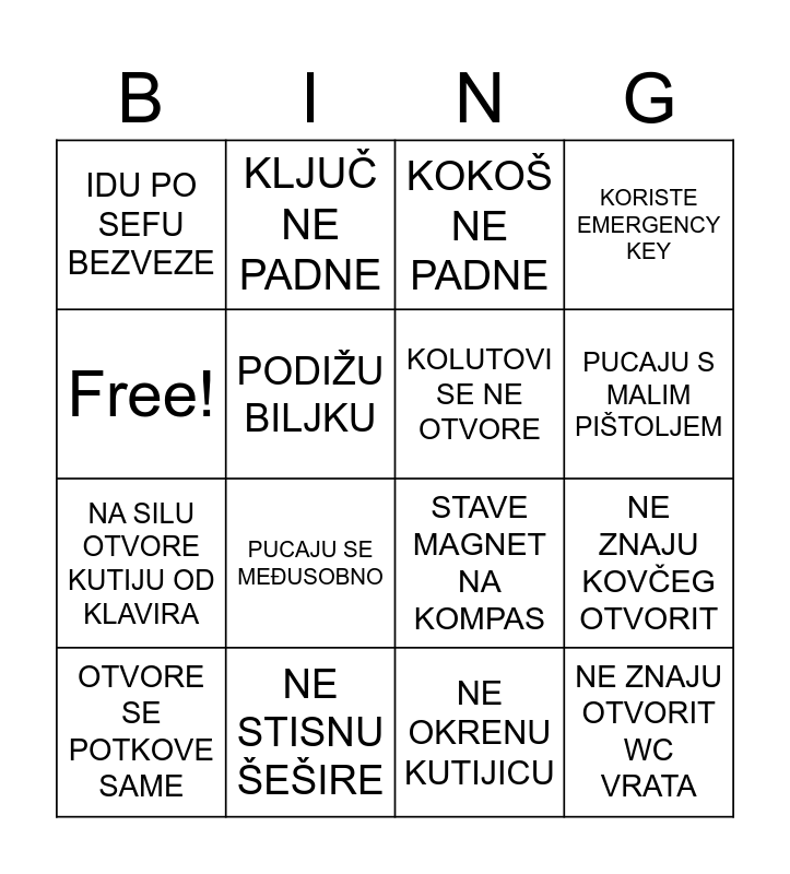 This bingo card has 16 words: NE STISNU ŠEŠIRE, NE ZNAJU KOVČEG OTVORIT, KOKOŠ NE PADNE, IDU PO SEFU BEZVEZE, NA SILU OTVORE KUTIJU OD KLAVIRA, KLJUČ NE PADNE, STAVE MAGNET NA KOMPAS, NE OKRENU KUTIJICU, Free!, PODIŽU BILJKU, OTVORE SE POTKOVE SAME, KORISTE EMERGENCY KEY, PUCAJU SE MEĐUSOBNO, PUCAJU S MALIM PIŠTOLJEM, KOLUTOVI SE NE OTVORE and NE ZNAJU OTVORIT WC VRATA.
