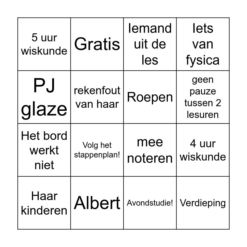 This bingo card has 16 words: Haar kinderen, Albert, Iemand uit de les, Iets van fysica, PJ glaze, Gratis, mee noteren, 4 uur wiskunde, 5 uur wiskunde, rekenfout van haar, Avondstudie!, geen pauze tussen 2 lesuren, Het bord werkt niet, Volg het stappenplan!, Roepen and Verdieping.