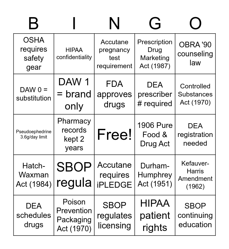 This bingo card has a free space and 25 words: SBOP regula, SBOP regulates licensing, FDA approves drugs, DEA schedules drugs, OBRA '90 counseling law, OSHA requires safety gear, DAW 0 = substitution, HIPAA confidentiality, 1906 Pure Food & Drug Act, Accutane requires iPLEDGE, DEA prescriber # required, Pseudoephedrine 3.6g/day limit, Durham-Humphrey Act (1951), Kefauver-Harris Amendment (1962), DAW 1 = brand only, FDA monitors safety, DEA registration needed, Accutane pregnancy test requirement, Controlled Substances Act (1970), Pharmacy records kept 2 years, SBOP continuing education, Poison Prevention Packaging Act (1970), Hatch-Waxman Act (1984), Prescription Drug Marketing Act (1987) and HIPAA patient rights.