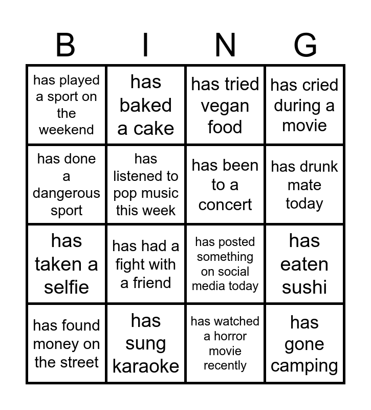 This bingo card has 32 words: Free!, has visited another country, has eaten sushi, has climbed a mountain, has gone camping, has been to a concert, has done a dangerous sport, has met someone famous, has baked a cake, has cooked dinner for someone, has drunk mate today, has tried vegan food, has won a competition, has failed an exam, has sung karaoke, has fallen asleep in class, has lost their phone, has posted something on social media today, has travelled alone, has played an instrument this week, has listened to a podcast this week, has started a new hobby this year, has watched a horror movie recently, has told a joke today, has found money on the street, has cried during a movie, has taken a selfie, has listened to pop music this week, has played a sport on the weekend, has celebrated a birthday recently, has had a haircut recently and has had a fight with a friend.