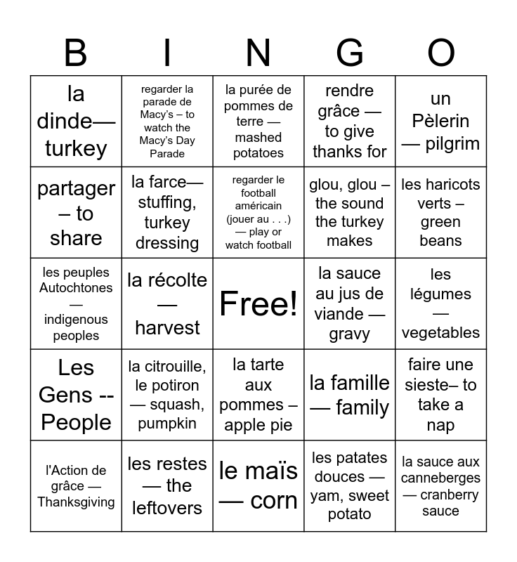 This bingo card has a free space and 29 words: l'Action de grâce — Thanksgiving, La Nourriture -- Food, la récolte — harvest, le dîner— dinner, la dinde— turkey, la purée de pommes de terre — mashed potatoes, la farce— stuffing, turkey dressing, la citrouille, le potiron — squash, pumpkin, la sauce au jus de viande — gravy, les restes — the leftovers, les légumes — vegetables, la sauce aux canneberges — cranberry sauce, le maïs — corn, les patates douces — yam, sweet potato, les haricots verts – green beans, la tarte à la citrouille (au potiron)— pumpkin pie, la tarte aux pommes – apple pie, Les Gens -- People, un Pèlerin — pilgrim, les peuples Autochtones — indigenous peoples, la famille — family, le dindon – the (live) turkey, glou, glou – the sound the turkey makes, partager – to share, rendre grâce — to give thanks for, regarder la parade de Macy’s – to watch the Macy’s Day Parade, faire une sieste– to take a nap, regarder le football américain (jouer au . . .) — play or watch football and faire une promenade– to go for a walk.