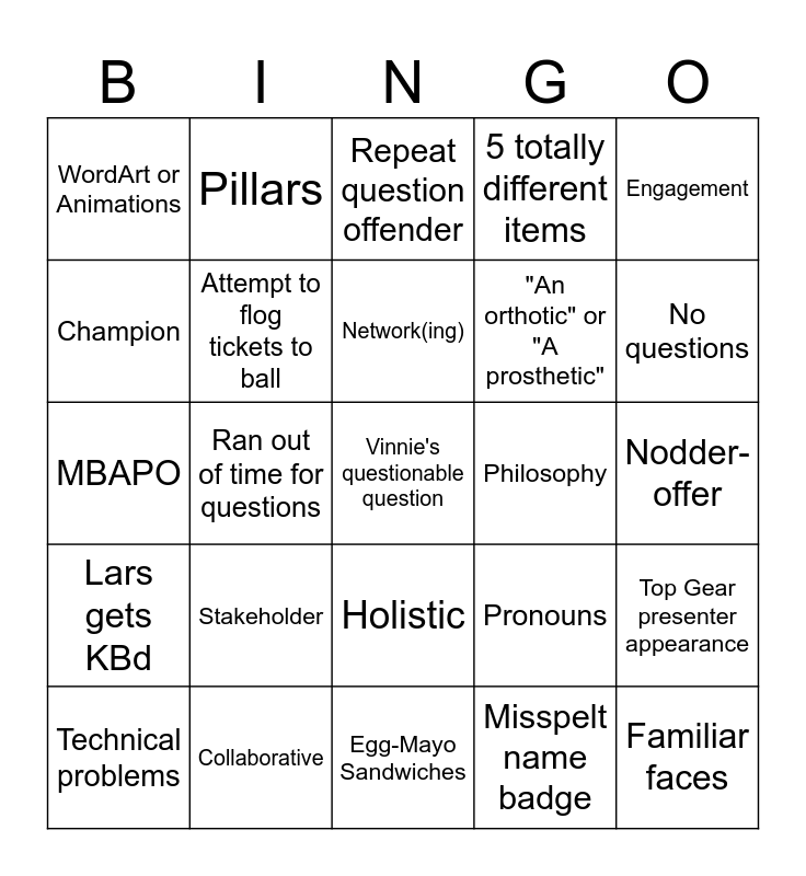 This bingo card has a free space and 24 words: Stakeholder, Collaborative, Network(ing), Technical problems, Engagement, WordArt or Animations, Champion, Pillars, Philosophy, Holistic, "An orthotic" or "A prosthetic", MBAPO, Pronouns, Top Gear presenter appearance, Attempt to flog tickets to ball, Misspelt name badge, Nodder-offer, Repeat question offender, No questions, Ran out of time for questions, Familiar faces, Lars gets KBd, 5 totally different items and Egg-Mayo Sandwiches.