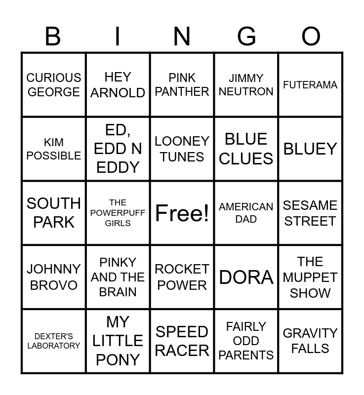 This bingo card has a free space and 75 words: SCOOBY DOO, WHERE ARE YOU?, THE FLINTSTONES, PINK PANTHER, DUCK TALES, TEENAGE MUTANT NINJA TURTLES, INSPECTOR GADGET, SPONGEBOB SQUAREPANTS, POKEMON, JETSONS, TEEN TITANS, ANIMANIACS, THE SIMPSONS, LOONEY TUNES, KIM POSSIBLE, DANNY PHANTOM, THE POWERPUFF GIRLS, RUGRATS, GRAVITY FALLS, FAMILY GUY, FUTERAMA, DARKWING DUCK, SOUTH PARK, ED, EDD N EDDY, HEY ARNOLD, JIMMY NEUTRON, TOM AND JERRY, DRAGON TALES, CLIFFORD, KING OF THE HILL, MIGHTY MORPHIN POWER RANGERS, CAT DOG, MICKEY MOUSE CLUBHOUSE, SAMURAI JACK, DORA, BLUEY, BLUE CLUES, CHARLIE BROWN, THOMAS & FRIENDS, SESAME STREET, FAIRLY ODD PARENTS, PHINEAS AND FERB, VEGGIE TALES, WONDER PETS, THE BACKYARDIGANS, CAILLOU, THE MAGIC SCHOOL BUS, DEXTER'S LABORATORY, CURIOUS GEORGE, GO DIEGO GO!, BEN 10, 6TEEN, ROCKET POWER, SAILOR MOON, ARTHUR, FELIX THE CAT, THE PROUD FAMILY, MUCHA LUCHA, CLASS OF 3000, THE CLEVELAND SHOW, YU-GI-OH, PINKY AND THE BRAIN, LILO AND STICH, SONIC X, RICK AND MORTY, THE BOONDOCKS, AMERICAN DAD, THE SPECTACULAR SPIDER-MAN, FREAKAZOID, LAZYTOWN, THE MUPPET SHOW, JOHNNY BROVO, MY LITTLE PONY, BATMAN, SPEED RACER and FOSTER'S HOME FOR IMAGINARY FRIENDS.