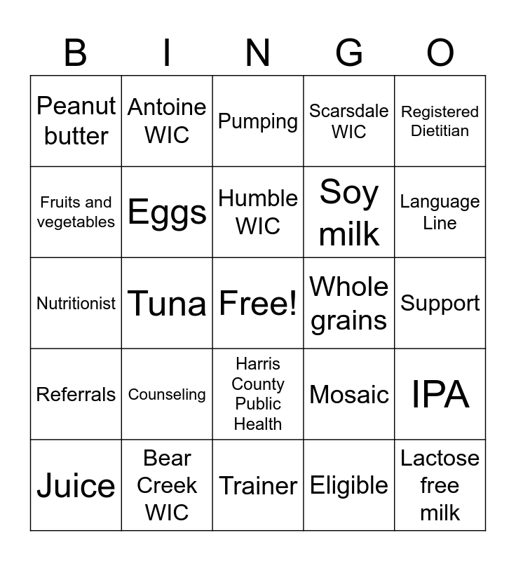 This bingo card has a free space and 85 words: Food package, Breastfeeding, Pumping, Women, Infant, Child, Postpartum, Pregnant, Formula, Whole milk, Low fat milk, Cheese, Eggs, Whole grains, Beans, Peanut butter, Juice, Fruits and vegetables, Baby cereal, Cereal, Baby foods, Soy milk, Lactose free milk, Yogurt, Tuna, Lab, Height and weight, Hemoglobin Testing, Iron, Intake, Counseling, Clerk, Peer counselor, Nutritionist, Medical Assistant, Lead Testing, Trainer, Outreach, Referrals, Language Line, Income, Residency, Identification, Register to Vote, Nutrition Notes, WIC Card, myWIC App, Rights and Responsibilities, Inventory, Reports, Antoine WIC, Humble WIC, Cypress Station WIC, Southeast WIC, Baytown WIC, Tomball WIC, Bear Creek WIC, Scarsdale WIC, Emerald Plaza WIC, Fallbrook WIC, Sheldon WIC, Call Center, WIC Director, WIC Assistant Director, WIC Administration, Registered Dietitian, Lactation Consultant, IPA, State Audit, Supervisor, Civil Rights, Hospitality, Card Reader, Signature Pad, Immunization Records, Harris County Public Health, Eligible, Healthy Foods, Nutrition Education, Encouragement, Support, Recipes, Classes, Mosaic and Front Desk.