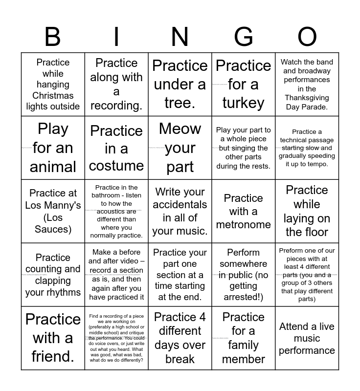 This bingo card has 12 images, a free space and 24 words: Make a before and after video – record a section as is, and then again after you have practiced it, Find a recording of a piece we are working on (preferably a high school or middle school) and critique the performance. You could do voice overs, or just write out what you heard. What was good, what was bad, what do we do differently?, Meow your part, Practice with a friend., Watch the band and broadway performances in the Thanksgiving Day Parade., Practice while hanging Christmas lights outside, Play for an animal, Practice along with a recording., Practice with a metronome, Practice your part one section at a time starting at the end., Play your part to a whole piece but singing the other parts during the rests., Practice at Los Manny's (Los Sauces), Perform somewhere in public (no getting arrested!), Preform one of our pieces with at least 4 different parts (you and a group of 3 others that play different parts), Practice in a costume, Practice for a family member, Practice while laying on the floor, Practice under a tree., Practice a technical passage starting slow and gradually speeding it up to tempo., Practice in the bathroom - listen to how the acoustics are different than where you normally practice., Attend a live music performance, Practice counting and clapping your rhythms, Practice for a turkey and Practice 4 different days over break.