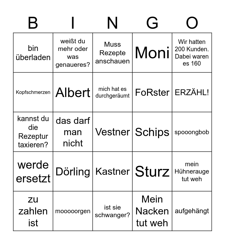 This bingo card has a free space and 24 words: Dörling, mooooorgen, mich hat es durchgeräumt, zu zahlen ist, Wir hatten 200 Kunden. Dabei waren es 160, bin überladen, Kopfschmerzen, weißt du mehr oder was genaueres?, Schips, Kastner, FoRster, kannst du die Rezeptur taxieren?, Sturz, mein Hühnerauge tut weh, Albert, Mein Nacken tut weh, spooongbob, Muss Rezepte anschauen, ERZÄHL!, das darf man nicht, aufgehängt, werde ersetzt, Moni and ist sie schwanger?.