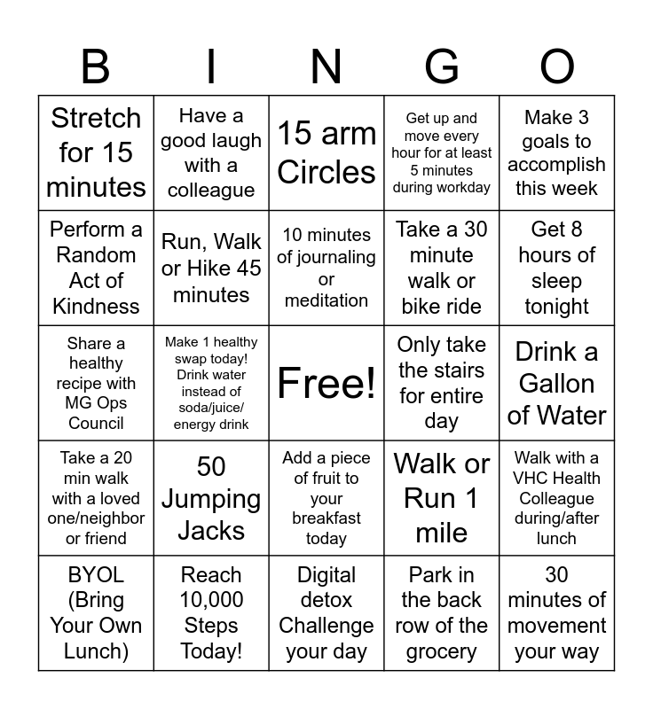 This bingo card has a free space and 24 words: 50 Jumping Jacks, Reach 10,000 Steps Today!, 10 minutes of journaling or meditation, BYOL (Bring Your Own Lunch), Make 3 goals to accomplish this week, Stretch for 15 minutes, Perform a Random Act of Kindness, Have a good laugh with a colleague, Only take the stairs for entire day, Add a piece of fruit to your breakfast today, Take a 30 minute walk or bike ride, Share a healthy recipe with MG Ops Council, Walk or Run 1 mile, Walk with a VHC Health Colleague during/after lunch, Run, Walk or Hike 45 minutes, Park in the back row of the grocery, Drink a Gallon of Water, 15 arm Circles, Get 8 hours of sleep tonight, Make 1 healthy swap today! Drink water instead of soda/juice/ energy drink, 30 minutes of movement your way, Take a 20 min walk with a loved one/neighbor or friend, Get up and move every hour for at least 5 minutes during workday and Digital detox Challenge your day.