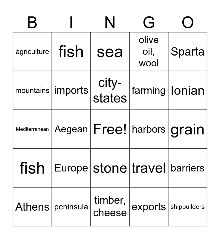 This bingo card has a free space and 24 words: Europe, peninsula, city-states, Athens, Sparta, agriculture, mountains, fish, harbors, stone, farming, Mediterranean, travel, barriers, imports, exports, grain, sea, Ionian, Aegean, shipbuilders, fish, olive oil, wool and timber, cheese.