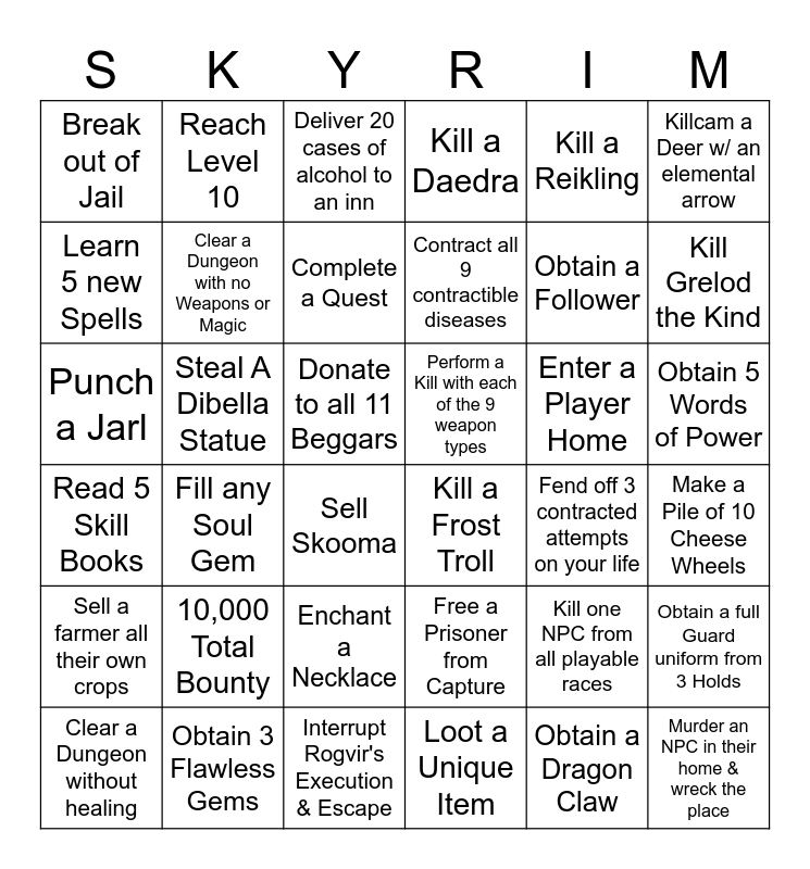 This bingo card has 61 words: Free!, Kill a Frost Troll, Shield Bash an NPC from max HP to 0 HP, Perform a Kill with each of the 9 weapon types, Make a Pile of 10 Cheese Wheels, Paralyze a Civilian, Learn 5 new Spells, Pray to Every Divine, Complete a Quest, Kill a Guard with a Crossbow, Kill a Daedra, Pickpocket an Enchanted Ring, Killcam a Deer w/ an elemental arrow, Clear a Dungeon without healing, Kill an enemy using a trap, Break out of Jail, Punch a Jarl, Kill a Reikling, Visit all 9 Hold Capitals, Clear a Dungeon with no Weapons or Magic, Steal A Dibella Statue, Deliver 20 cases of alcohol to an inn, Sell Skooma, Fill any Soul Gem, Complete Brynjolf's Quest, Obtain 3 Flawless Gems, Kill one NPC from all playable races, Kill a Giant and take it's toe, Contract all 9 contractible diseases, Loot a Unique Item, Win a Brawl, Speak to all 9 Jarls, Die to a Skeever, Get Married, Reach Level 10, 10,000 Total Bounty, Bankrupt a Merchant, Kill Grelod the Kind, Interrupt Rogvir's Execution & Escape, Obtain a Follower, Rent a room in 5 different inns, Enter a Player Home, Donate to all 11 Beggars, Meet both General Tullius & Ulfric Stormcloak, Read 5 Skill Books, Free a Prisoner from Capture, Spend EXACTLY 1000 gold in one shopping trip, Kill a Hagraven, Hold 10,000 Gold, Obtain 5 Words of Power, Fend off 3 contracted attempts on your life, Meet a Ghost, Murder an NPC in their home & wreck the place, Enchant a Necklace, Learn one min. Apprentice Lvl Spell from all 5 schools, Obtain a full Guard uniform from 3 Holds, Obtain a Dragon Claw, Join a Guild, Shoplift 200 gold value from 5 Separate Shops and get away with it, Sell a farmer all their own crops and Feed as a Vampire.