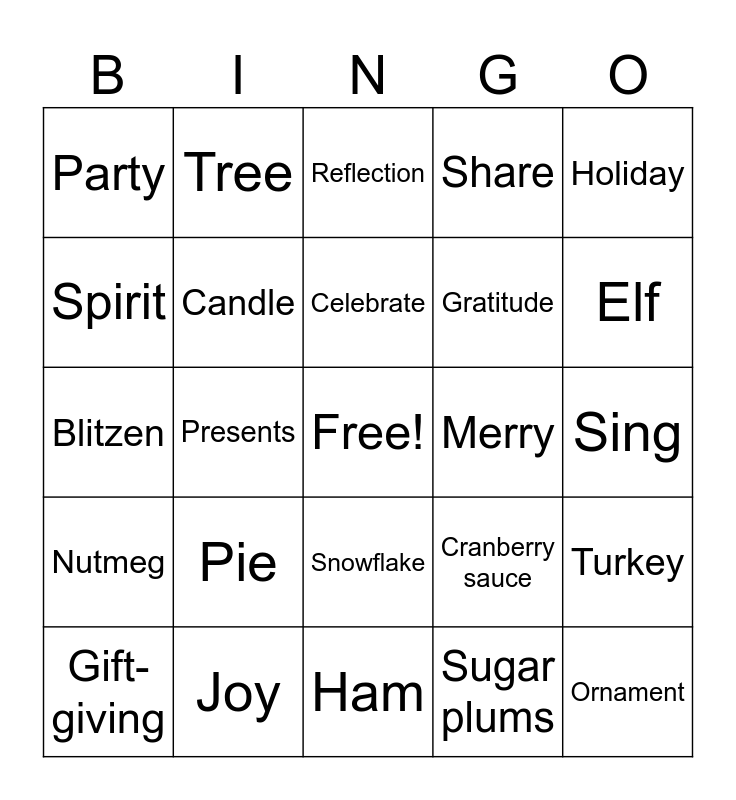This bingo card has a free space and 74 words: Advent, Caroling, Celebrate, Ceremony, Cheer, Decorate, Exchange, Feast, Festival, Gathering, Gift-giving, Goodwill, Gratitude, Holiday, Hospitality, Joy, Kindness, Merry, Parade, Party, Presents, Reflection, Share, Sing, Spirit, Togetherness, Tradition, Travel, Decorations, Bells, Candle, Cedar, Chimney, Evergreen, Holly, Icicle, Lights, Mistletoe, Ornament, Pine, Ribbon, Snowflake, Star, Stocking, Tinsel, Tree, Wreath, Yule log, Candy cane, Cider, Cinnamon, Cookies, Cranberry sauce, Eggnog, Fruitcake, Gingerbread, Ham, Hot chocolate, Marshmallow, Nutmeg, Pie, Pumpkin pie, Sugar plums, Turkey, Blitzen, Cupid, Dancer, Dasher, Elf, Frosty, Jolly, Prancer, Rudolph and Santa Claus.