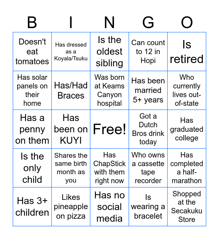 This bingo card has a free space and 24 words: Shares the same birth month as you, Likes pineapple on pizza, Was born at Keams Canyon hospital, Has 3+ children, Is retired, Doesn't eat tomatoes, Has solar panels on their home, Has dressed as a Koyala/Tsuku, Got a Dutch Bros drink today, Has ChapStick with them right now, Has been married 5+ years, Has a penny on them, Who owns a cassette tape recorder, Has completed a half-marathon, Has/Had Braces, Is wearing a bracelet, Has graduated college, Is the oldest sibling, Who currently lives out-of-state, Has been on KUYI, Shopped at the Secakuku Store, Is the only child, Can count to 12 in Hopi and Has no social media.