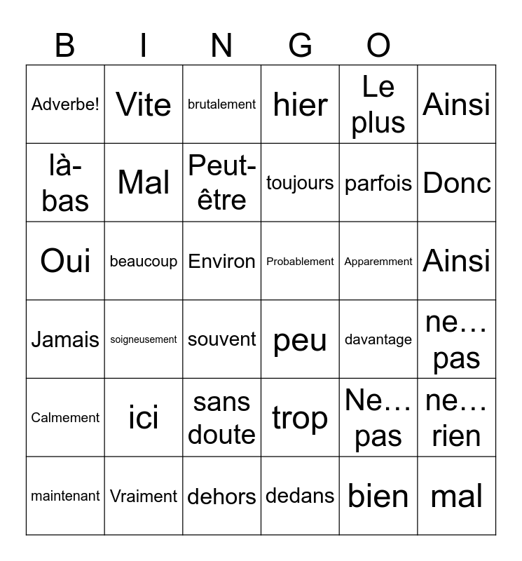 This bingo card has 68 words: Certainement, Oui, Volontiers, Vraiment, Ne… pas, Ne… plus, Vite, Bien, Mal, Correctement, Ainsi, Doucement, Environ, Le plus, Alors, Ainsi, Donc, Adverbe!, Par conséquent, Apparemment, Peut-être, Jamais, Probablement, Calmement, rapidement, lentement, bien, mal, soigneusement, facilement, brutalement, discrètement, aujourd’hui, demain, hier, maintenant, bientôt, souvent, toujours, parfois, ici, là, là-bas, partout, nulle part, ailleurs, dedans, dehors, beaucoup, peu, trop, assez, très, davantage, tellement, un peu, ne… pas, ne… jamais, ne… plus, ne… rien, ne… personne, certainement, probablement, sûrement, peut-être, évidemment, sans doute and apparemment.