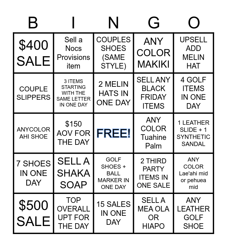 This bingo card has a free space and 48 words: $250 SALE, ANY LEATHER GOLF SHOE, SELL LIMITED EDITION MELIN HAT, 15 SALES IN ONE DAY, SELL A SHAKA SOAP, ANY COLOR ULELE, Sell a Nocs Provisions item, SHOE + SANDAL IN ONE SALE, COUPLE SLIPPERS, DO A DROP SHIP ORDER, 3 ITEMS STARTING WITH THE SAME LETTER IN ONE DAY, ANY COLOR MAKIKI, ANY COLOR Lae'ahi mid or pehuea mid, 2 THIRD PARTY ITEMS IN ONE SALE, 2.3 UPT FOR THE DAY, ADD KAENON GLASSES TO SALE, 2 MELIN HATS IN ONE DAY, ANY COLOR Tuahine Palm, ANY WOMENS GOLF SHOE, UPSELL ADD MELIN HAT, $150 AOV FOR THE DAY, SELL A MEA OLA OR HIAPO, $400 SALE, SELL ANY BLACK FRIDAY ITEMS, ADD ON WATERPROOF LEATHER SANDAL OR SLIDE, 4 GOLF ITEMS IN ONE DAY, $500 SALE, 1 LAEAHI LI ILI AND 1 MI’I IN SAME DAY, GOLF SHOES + BALL MARKER IN ONE DAY, 7 SHOES IN ONE DAY, LEATHER SANDAL + BEACH SANDAL, 2 GOLF SHOES IN ONE SALE, 3 OHANA’S IN ONE SALE, ANY TWO LEATHER SANDALS IN ONE SALE, TOP OVERALL UPT FOR THE DAY, SAME SHOE/SANDAL IN SAME COLOR, ADD A GREETING CARD, 1 LEATHER SLIDE + 1 SYNTHETIC SANDAL, 5 SHIPPED ORDERS IN ONE DAY, SELL SHARK BOOK, ANSWER 3 PRODUCT QUESTIONS IN ONE DAY, ANY COLOR HUIA SHOE, COUPLES SHOES (SAME STYLE), 4 MELIN HATS IN ONE DAY, ANYCOLOR AHI SHOE, TOP OVERALL AOV FOR THE DAY, ANY LEATHER SHOE + LEATHER SANDAL and MELIN + GOLF SHOE.